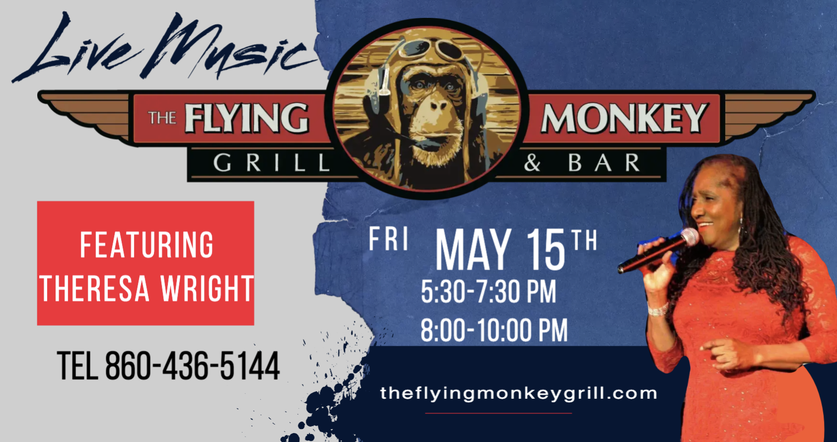 Theresa Wright Friday, May 15, 2026 5:30 PM 10:00 PM 17:30 22:00 The Flying Monkey Grill & Bar 2095 Berlin Turnpike Newington, CT, 06111 United States (map) Google Calendar ICS